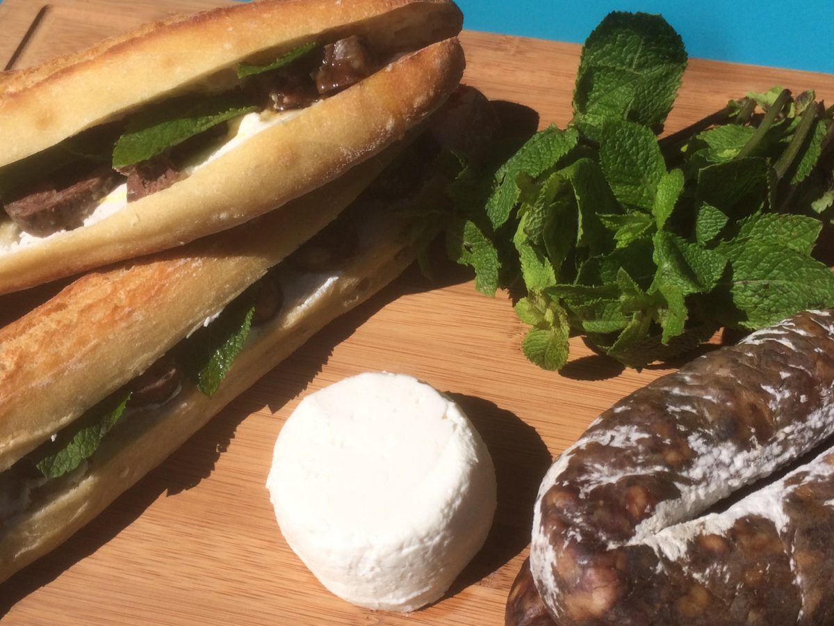 Figatellu grillé sur tapis de chèvre frais au lait cru, menthe fraîche, miel de crête et mâche. Cet assemblage sucré/salé nous offre un sandwich aussi gourmand que parfumé.